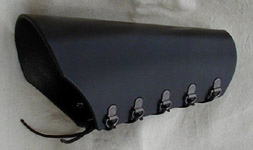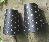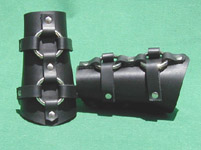 Black calfskin leather and heavy duty bosses form a portcullis pattern over contrasting leather. Laces provide for easily adjustable fit. See size chart for dimensions. Leather Colors: Black, Dark Brown, Chestnut, Dark Tan Portcullis Vambraces w/Laces - $85/pair |
