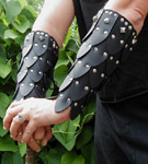 These leather scale bracers feature a heavy rivet pattern. Each vambrace is constructed of 1-1/2-inch scales that are sequentially riveted to each other as the bracer is formed, resulting in a piece that is a sturdy 2 layers thick while remaining flexible and comfortable. The rivets keep the scales tightly together - no spreading apart or upward rolling. Their finished size is approximately 7-1/2 inches at the wrist, 11 around the forearm (when laid flat) and 10 inches from wrist to elbow. Laces provide for an adjustable fit. We use 6 oz leather (just under 1/8 inch thick per layer) for our scale bracers, so they remain supple enough for comfortable wear. The studs and bosses decorating the upper edge are available in nickel only, but you have a choice of nickel or brass rivets when ordering these bracers. Leather Colors: Black, Dark Brown Hardware: Studs & bosses in nickel only; Rivets in choice of nickel or brass Riveted Scale Bracers w/Laces - $125/pair |
