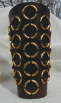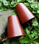 We first created these vambraces for a hardcover photo-shoot, and liked them so much that we decided to offer them here. We augment our hand-tooled leather vambraces with strong, superbly-designed brass splints that we fasten with copper-peened rivets. The finished effect is nothing short of stunning ~ see the "Large View" photo to appreciate the details. See size chart for dimensions. Leather Colors: Black, Dark Brown, Chestnut Splinted Vambraces w/Laces - $95/pair |