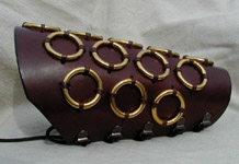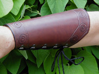 protect you from your foes. Shown here in medium brown with brass rivets. See size chart for dimensions. Leather Colors: Black, Dark Brown, Chestnut, Dark Tan Hardware: Nickel or Brass Mercenary Bracers w/Laces - $58/pair |