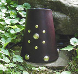 the pageantry and romance of the Age of High Chivalry. Shown here in dark brown with brass rivets and domed nickel mounts fastened with a brass rivet through their centers. See size chart for dimensions. Leather Colors: Black, Dark Brown, Chestnut, Dark Tan Hardware: Nickel or Brass High Chivlary Bracers w/Laces - $55/pair |