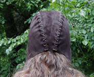 Shown in chestnut brown leather with a Lindisfarne Spiral adornment, our headbands are also available in dark tan, dark brown or black leather with black interwoven strap and your choice of nickel silver adornment. Each one is custom fit to its wearer, with a lace tie at the back which allows for some adjustability (see Royal Circlet below for tie method). Please