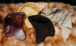 Our more "traditional" version of a Mongol Helm, featuring fur-trimmed brim, lamellar aventail and cheekplates, and an optional horsetail plume. Fashioned completely of heavy leather with nickle or brass rivets. Fur trim is available in natural rabbit (as shown, colors will vary) or black sheepskin. Fur and sheepskin extends to the inside brim of the helm for maximum comfort. Shown in black, frame and plate colors of black, dark brown and chestnut leather available in the combination of your choosing with brass or nickel rivets.