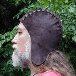 Featuring a six-sided construction of firm, heavy leather in frame and plates, we show this helm in dark brown with black plates and brass rivets. Frame and plate colors of black, chestnut and dark brown available in the combination of your choosing with brass or nickel riveting. A buckled chinstrap is included to keep your helm safely on your head in battle.